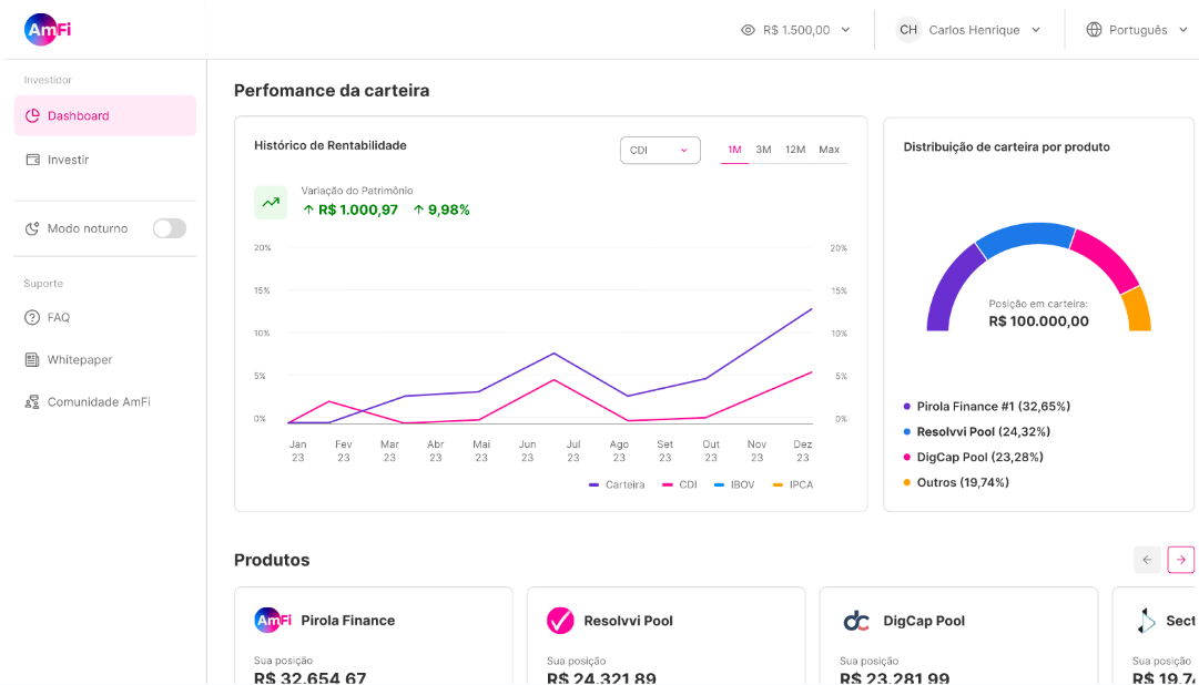 5. Feito isso, será possível acompanhar **em tempo real**, através do dashboard da plataforma, como está a evolução do seu portfólio e o desempenho da operação investida.