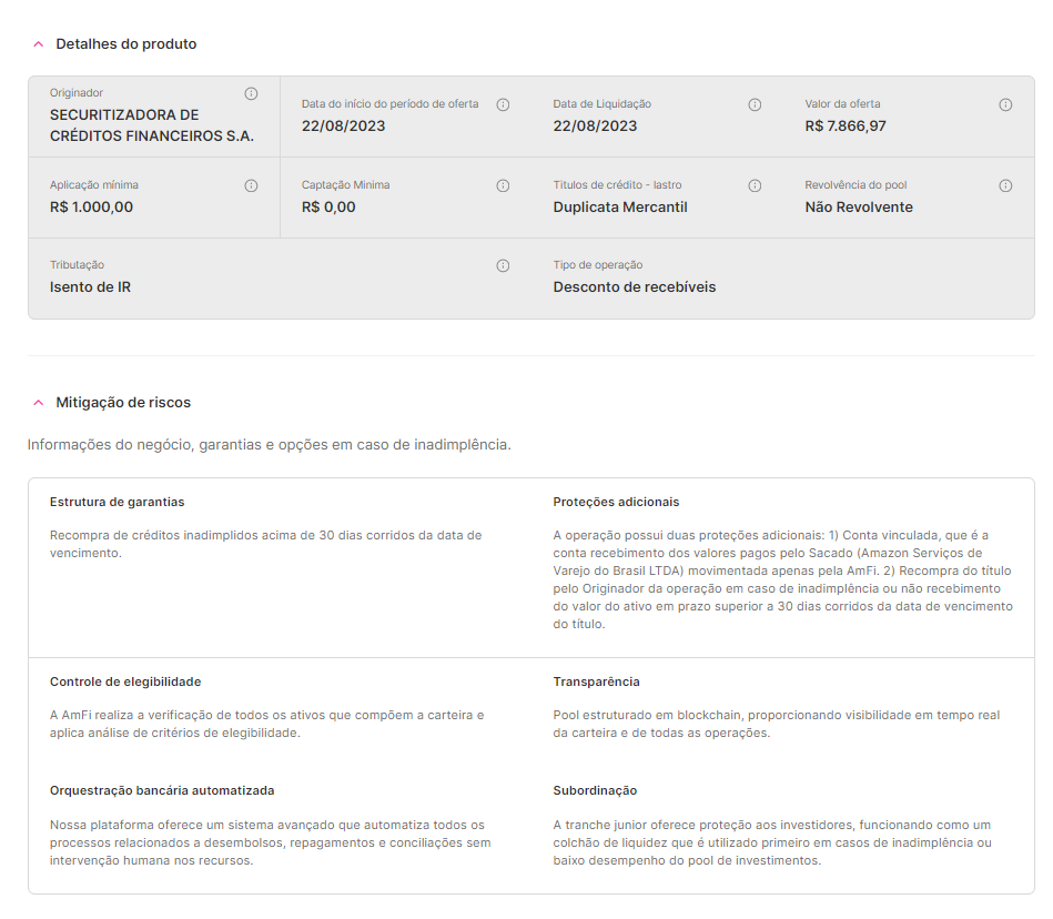 <figure><img src="https://536991122-files.gitbook.io/~/files/v0/b/gitbook-x-prod.appspot.com/o/spaces%2Fc75xidFR1xEUpOFMNtmE%2Fuploads%2Fwgdvj9czurHWIkDeZjcY%2Fimage.png?alt=media&#x26;token=ab05b96e-5daa-4ffe-8abb-a8abc9b8bf34" alt=""><figcaption><p>Informações disponíveis ao investidor, além delas, existe uma série de documentações em cada oportunidade</p></figcaption></figure>